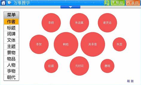身为语文课代表,自然对文学深感兴趣。这是用万维搜学学习语文诗词,可以按照作者、标题、词牌、文体、人物、朝代等划分类别,这样所有的诗词在脑海中会有一个清晰的框架。作者菜单下列举了李纲、韩愈、谢灵运等名家。
