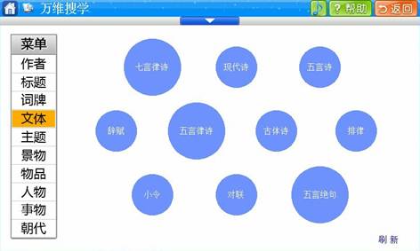 如果按文体学习,菜单下有七言律诗、五言律诗、古体诗、现代诗,还有小令、对联,样样俱全。