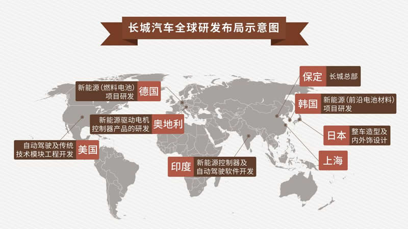 时至今日,哈弗已构建以中国总部为核心,涵盖欧洲、亚洲、北美的全球研发布局,先后在日本、美国、德国、印度、奥地利和韩国设立海外研发中心,并在硅谷设立新技术孵化实验室,进行新技术、新产品的研发。海外销售网络遍布亚洲、南美洲、非洲和大洋洲等多个国家及地区。