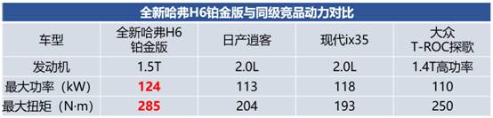 最后,重点来了,我们来看一下动力层面。自驾游很多时候需要“翻山越岭”,对动力要求更为严苛。全新哈弗H6铂金版搭载哈弗自主研发的“双十佳”动力总成,无惧高海拔、长时间爬坡等路况。其124kW的最大功率、285N·m的峰值扭矩,轻松超越大量同级竞品车型,无论是搭载2.0L发动机的逍客、ix35,还是1.4T发动机的探歌,在全新哈弗H6铂金版面前都甘拜下风。