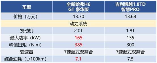 首先对比动力,由下表可以看出,全新哈弗H6 GT版在发动机参数上全面碾压吉利博越PRO。