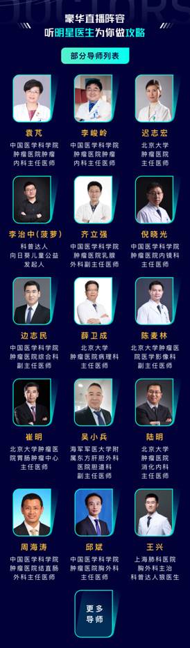 本着为肿瘤患者做抗癌攻略的认真态度,本次直播木棉花团队邀请了国内顶级医院专科专家主任、CSCO理事名医、大三甲临床专家、新疗法临床试验组长、肿瘤临床营养专家、肿瘤临床康复专家、医保机构专家、公益组织掌门人、网红抗癌科普达人等一些列肿瘤领域内的顶尖精英,准备开启一场为期三个月的抗癌攻略之旅。